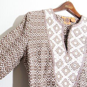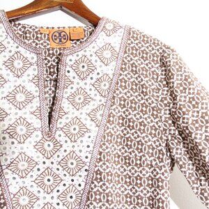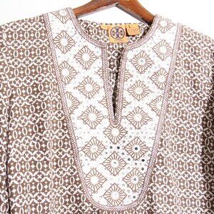 Tory Burch 100% Linen Tunic Top Brown Cream Printed Embroidered Mirrored Size 10
