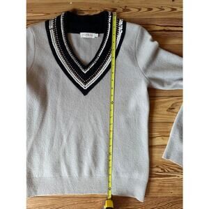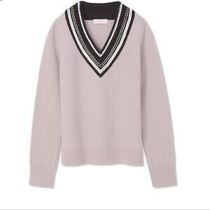 Tory Burch 100% Merino Wool V-Neck Sequin Rhinestone Beige Long Sleeve Sweater