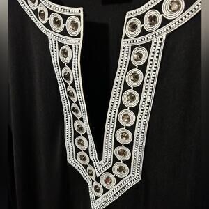 Pure Silk Tunic Top with crystal and embroidery embellishment. The neckline has snaps to close it to your desired height and the silk is in great condition. FYI, minor signs of wear but no missing gems, holes, or snags.