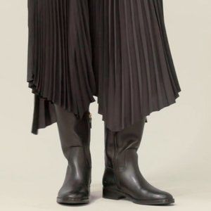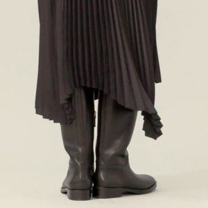 An equestrian classic: our new Riding Boot, in smooth leather with signature 'T' hardware in polished gold. Designed with a comfortable flat heel, it works with midi skirts and dresses β wear with bare legs now, tights later, to transition from warmer to cold weather.