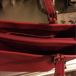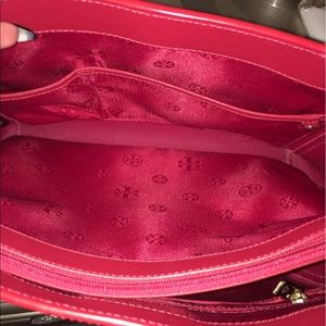 Tory burch small bucket tote. Scratch-resistant leather gold hardware big compartment enough to put iPad for open four open small packets clip for keys,light weight. I also have tan color as well.