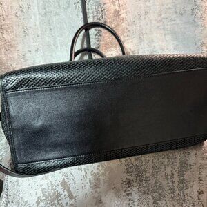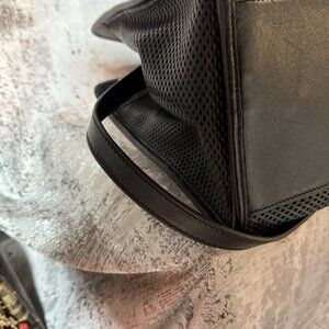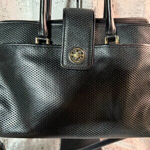 Beautiful perforated leather Tory Burch has 2 exterior zip pockets and three inside compartments to hold all of your things. It measures 14" x 7" x 9" and would be a beautiful work bag. Room for a small laptop, tablet, phone and so much more. Feel free to ask questions about this gently used bag.