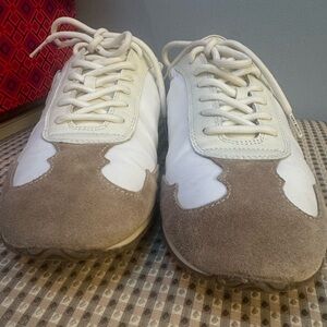 Tory Burch Tory Retro Runner Sneakers in white and ivory Cerbiatto Size 9 In really good condition and Runs Narrow, Nylon with Leather upper and leather insole