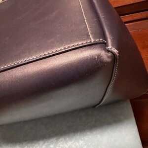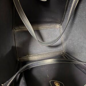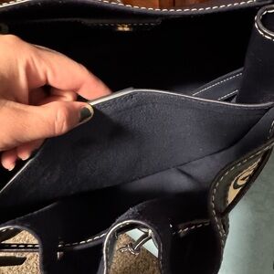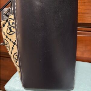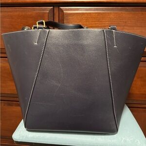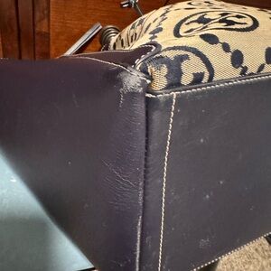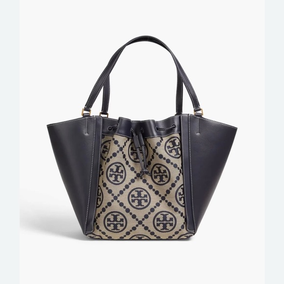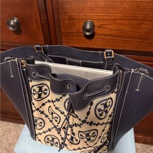 his is a Tory Burch T Monogram McGraw Dragonfly Tote bag in navy and beige jacquard and leather. This is a very spacious tote. I used it for work . It fits a laptop with plenty more space. ( last picture for reference with laptop inside) signs of wear. Please see all pictures . Scratches mostly on the corner. Overall this bag still has plenty of life left. I probably paid about $400 + when I purchased it.