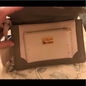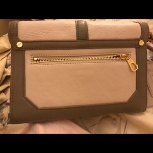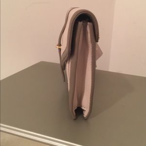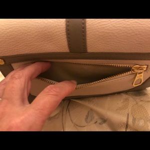 Tory Burch leather wristlet/clutch. 2 tone colors of cream & dark taupe. Zippered pockets: one on outside front, the other on back. Gold tone hardware. Plastic covering still on inside logo. Original tiny spot on back below rivet, as show in 2nd photo (bottom left) barely noticeable. 💗 No trades. No PayPal.