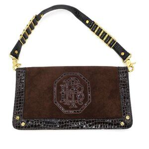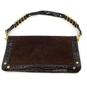 Tory Burch Academy Espresso Suede Croc Embossed Clutch Gold Chain Shoulder Bag