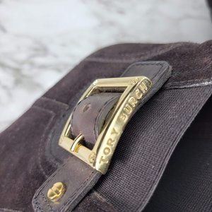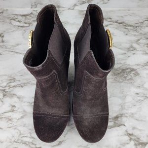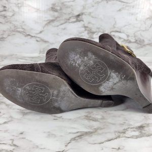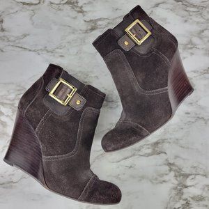 Tory Burch Adrienne Bootie. Brown suede. Gold buckle accent at outside ankle. Logo at top of buckle. 4" wedge heel. Excellent Condition!! Fast Shipper!