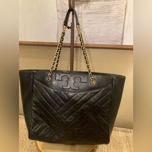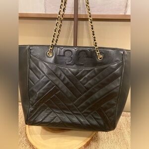 The Tory Burch Alexa tote is a large, black bag made from super soft leather with a quilted chevron print design. It features a stylish hexagon shape with double handles and gold hardware. The bag has a magnetic and snap closure, inner pockets, and a black fabric lining. The chain detailing adds a touch of elegance to this designer piece from the Tory Burch Alexa collection, perfect for city outings and classic styles. This is such a beautiful bag and good used condition.