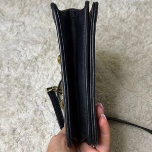 Stylish black leather crossbody bag. Features gold chain strap. Iconic Tory Burch design.