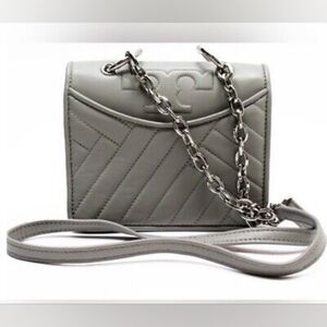 Tory Burch Alexa Quilted Mini Gray Leather Shoulder Bag Chain Strap