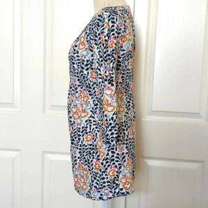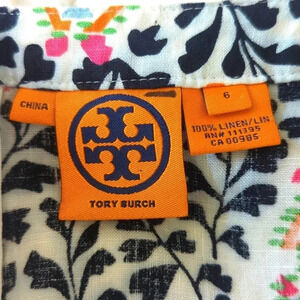 Tory Burch Alexiane Colorful Linen Tunic Women's Blouse. Zipper and eyelit closure on back. The neckline has eyelit closures as well. Navy, orange, light blue, green and pink design.