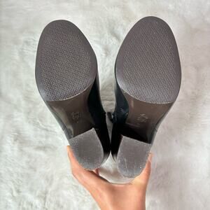 Soft and supple black leather booties by Tory Burch. Leather upper, leather lining and synthetic sole. They feature an almond shaped toe and chunky 4 inch wooden heel. Zip on the inner side. They're in excellent preowned condition with minimal signs of wear. See photos.