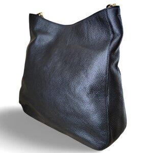 Elevate your style with this authentic Tory Burch Amanda Hobo Bag, beautifully crafted in supple black pebbled leather that’s buttery soft yet structured enough to hold its shape. The signature raised gold Tory Burch logo medallion gleams on the front pocket, a statement of understated sophistication.