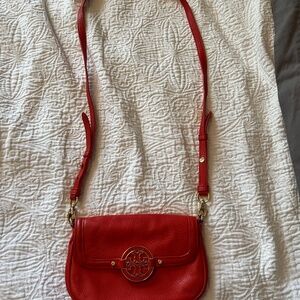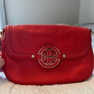Tory Burch Amanda Leather Mini Crossbody Bag Red EUC Elevate your accessory game with this chic Tory Burch Amanda Leather Mini Crossbody Bag in a striking red hue. Crafted from luxurious pebbled leather, this bag is designed for both style and practicality, making it a must-have addition to your wardrobe. Features: Versatile Design: Use it as a clutch or wear it crossbody with the removable longer strap. Perfect for day-to-night transitions! Compact Yet Functional: With dimensions of approximately 4"H x 8"W x 2"D, it's compact enough to carry your essentials while staying stylish. Interior Organization: Keep your cards organized with three convenient interior card slots. Signature Style: The front flap features a hidden snap-button closure, maintaining a sleek and sophisticated look. Condition: This bag is in good condition. Grab this elegant piece and add a touch of luxury to your everyday ensemble.