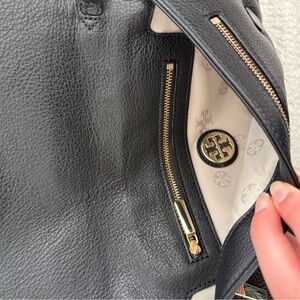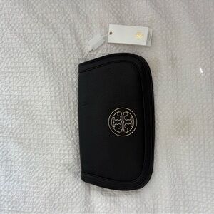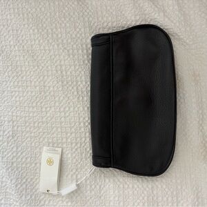 Tory Burch Amanda Logo Clutch in Black. Genuine black leather clutch with 2 zipper pouches for organization. Gold hardware and logo. New With Tags, missing strap (worn without due to personal preference). Elegant and classic.