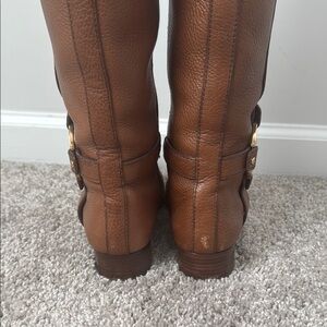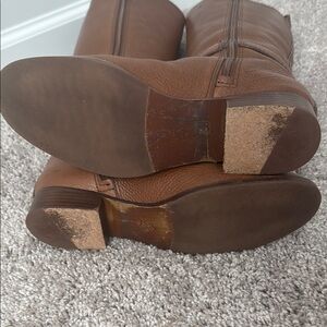 These Tory Burch over the knee boots feature a rich brown leather finish, offering a sleek and sophisticated look. Designed with a classic equestrian style, they boast a straight, fitted shaft and a convenient full-length zipper for easy wear. The rounded toe and flat sole ensure comfort and timeless elegance.
