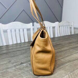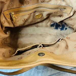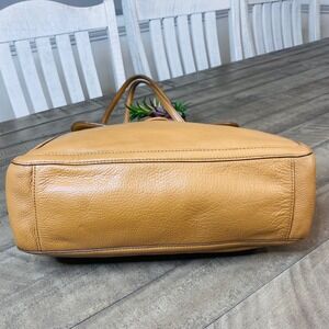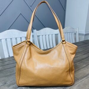 Camel pebbled leather Tory Burch Amanda Small Easy Tote with gold-tone hardware, single pocket at front exterior with magnetic closure, logo placard at front flap, dual flat shoulder straps, beige logo jacquard lining, three pockets at interior walls, single zip pocket and magnetic snap closure at top.