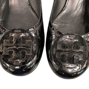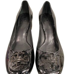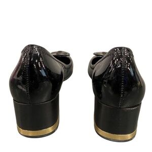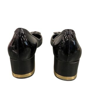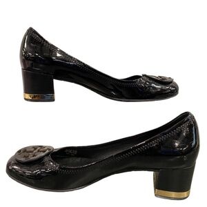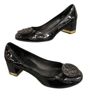 Tory Burch Amy Patent Leather Block Heel Pumps Black Gold Trim Logo Size 8 M
