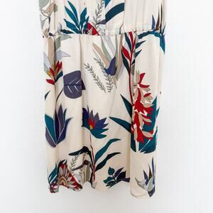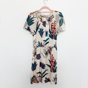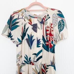 Tory Burch tropical floral print dress in lightweight 100% silk with soft polyester lining. Features a short sleeve silhouette, gathered waist, and flowy relaxed fit. Ivory base with colorful botanical motifs. Size 0. Excellent condition. No visible flaws. See all photos for details.
