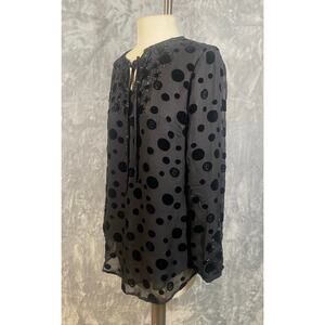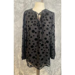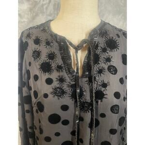 Tactile dots pattern, a burnout pattern that is illuminated by sparkling black beading. Fully beaded tie-detail split neckline and gathered cuffs. Slips on over head. Slightly gathered shoulders. Lined.