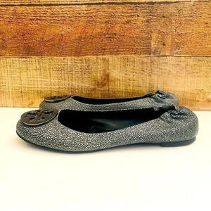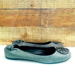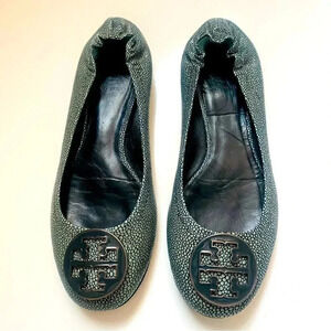 Tory Burch Aqua Reva Speckled Pebbled Leather Logo Flats
