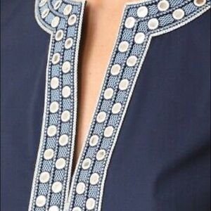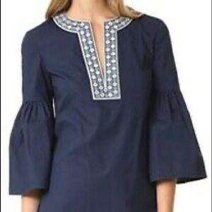Tory Burch Ariana tunic.Embellished split neckline.Three-quarter bell sleeves.Relaxed silhouette.Slipover style.Cotton/spandex