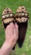 Pony or calf hair upper with a leopard or cheetah print in tan and brown, leather sole, brown suede trim, large gold-tone studs across toes.