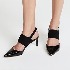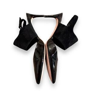 The refined silhouette of these sandals features a pointed toe and a delicate strap, adding a touch of femininity and grace. The black suede finish exudes a sophisticated charm, making these pumps ideal for both professional settings and evening events. The adjustable slingback strap ensures a customized fit, while the cushioned footbed offers added comfort.