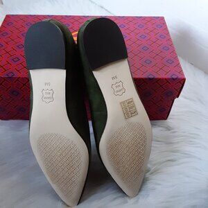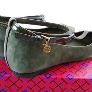 Brand new in box. Tory Burch Ashton T-strap Flat Suede size 5M In Leccio/ Leccio color. A T-strap extends the lean lines of a pretty pointy-toe flat finished with a double-T charm at the buckle. Pet and smoke free home.