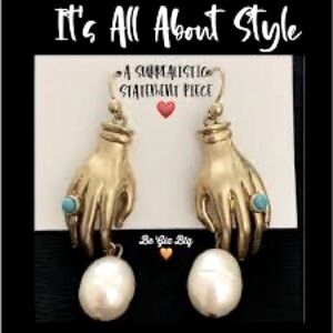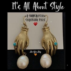 -A surrealistic statement piece, the Hand Earring sculpts cast brass into an artful drop featuring genuine turquoise and a baroque pearl. Made for pierced ears.