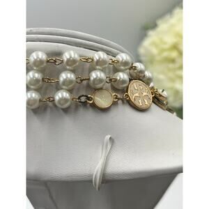 Tory Burch Authentic Long Pearl Logo Medallion Multi-Strand Gold 60" Necklace
