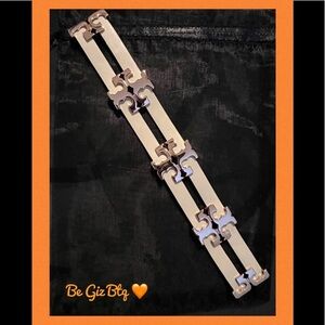 Classic Tory Burch hardware gleams on the double leather bands of this sophisticated and versatile bracelet. 1" width Slide-bar closure Leather/Rose Gold/ Sand.