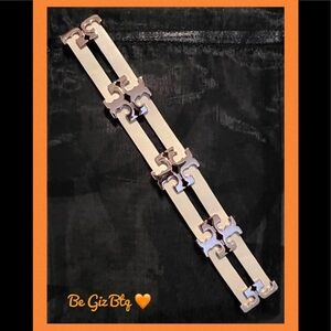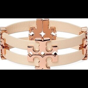 Classic Tory Burch hardware gleams on the double leather bands of this sophisticated and versatile bracelet. 1" width Slide-bar closure Leather/Rose Gold/ Sand.
