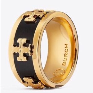 NWOT Tory Burch Authentic Wide Band Black Enamel With Gold Raised Logo Ring 7