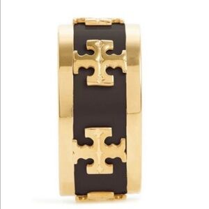 🆕 Tory Burch Authentic Wide Band Black Enamel With Gold Raised Logo Ring 7