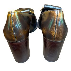 A menswear silhouette with a curved block heel and oversized lacquered buckle. Our new square-toe loafer has a distinctive ombré effect with subtle shine.