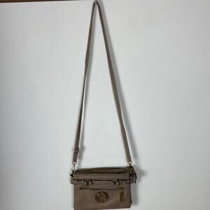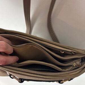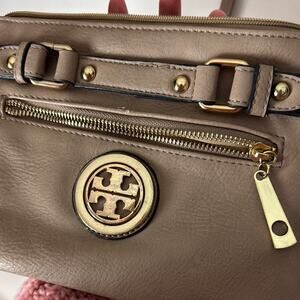 Used Tory Burch Shoulder Bag. Listed as used due to some scuffed on the Tory Burch metal emblem. Everything else is in great shape! Feels like leather. I'd describe the color as a shade of taupe.