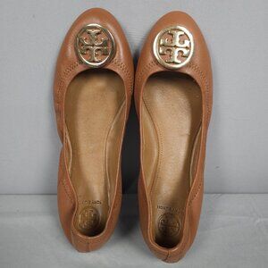 Tory Burch Ballet Flats Women 8 Brown Tan Leather Slip-On Gold Medallion Logo