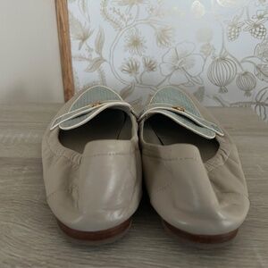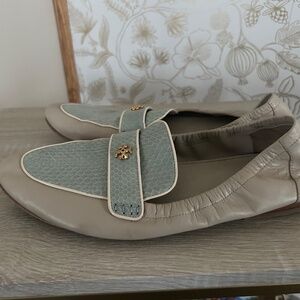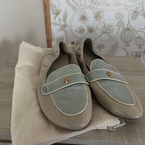 Loafers are in used condition. Scuff mark on the front left loafer, some marking on the inner soles. Colors are light tan and teal with the gold Tory Burch logo.