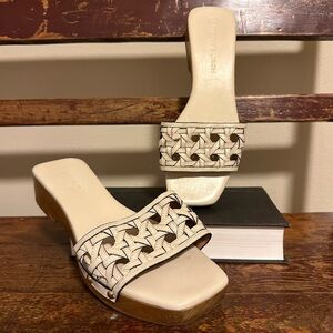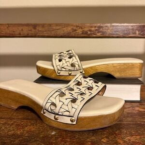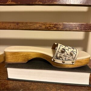 Tory Burch Basketweave Calfskin Cream Clog Sandals Wooden Shoes