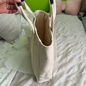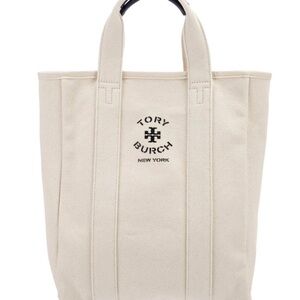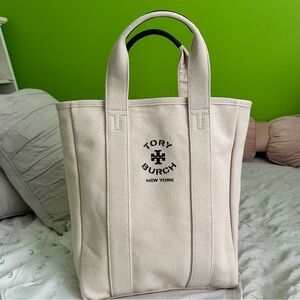 Elegant Tory Burch tote in beige canvas. Features iconic logo print. Blue leather handles. Inside large pocket. Size 15.5"x14.5"x2.5". New, never used. It came as a gift with purchase of a bag.