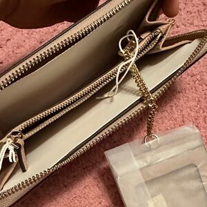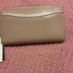 Chic Tory Burch wallet in smooth beige leather. Features iconic logo detail. Ideal for stylish organization.New with tags