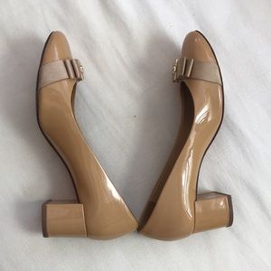Tory Burch Beige Tan Taupe Patent Leather Pump w bow accent size 8