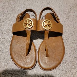 This is a pair of Tory Burch Benton 2 sandals in size 6.5. Color is Royal Tan/Rolled Brass. These are a thong style slingback sandal with an adjustable slingback strap and a gold emblem on the front. They have only been worn a few times and are in excellent condition.