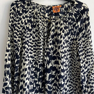Navy and tan Tory Burch patterned long sleeve top with keyhole neck in good used condition.