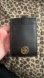 Sleek black card holder. Features gold logo and chain. Includes strap for easy carrying.