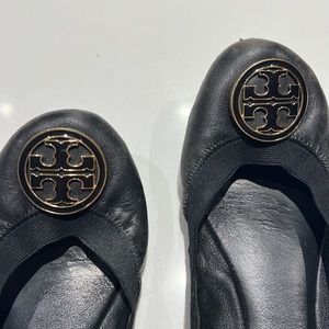 Black Tory Burch ballet flat. The elastic makes them very comfortable! Always worn with no show socks. I have 5 pairs that I wore for work, but since I work from home now, I want to sell them all!