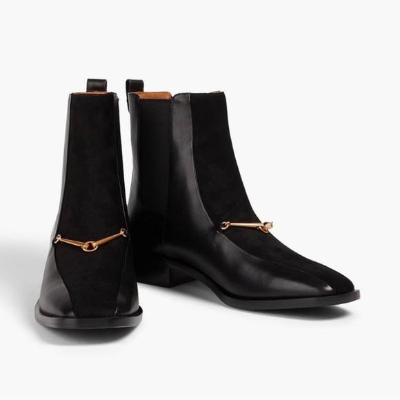 Ankle Boots leather panelled suede Trims buckle-embellished pull Tabs elasticated Inserts square Toe pull On leather/rubber Sole imported.