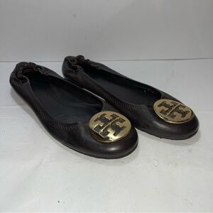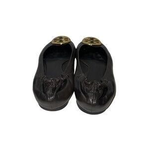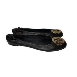 Elegant black flats with signature gold logo. Comfortable and stylish.