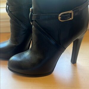 Chic black heeled boots with stylish strap detail. Perfect for elevating any outfit.
